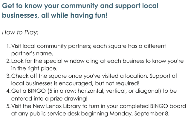 - Visit our community partners and fill out a bingo card to be entered to win a prize!